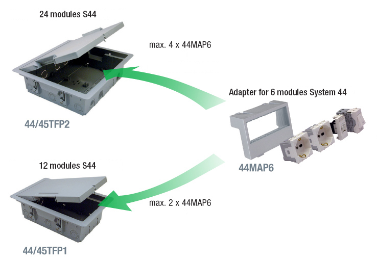 For the installation of wiring accessories into double floors or classic floors with a concrete screed, Ave offers outlet socket boxes in two sizes or with a total of 4 combinations in terms of capacity, depending on whether System 44 or System 45 modules are being used: