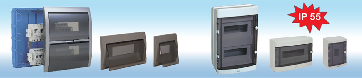 - Enclosures with covers with IP40 and IP55 protection for DIN modules, intended for wall mounting