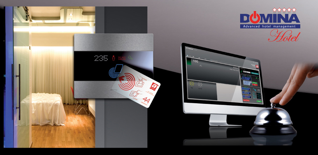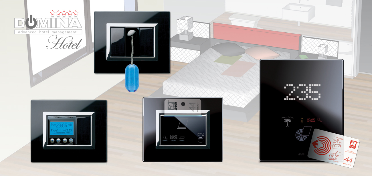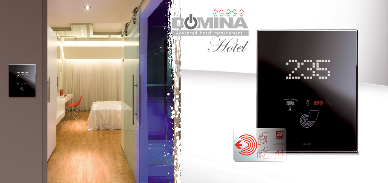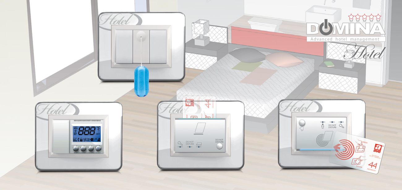 The Ave hotel management system is not only characterised by a sophisticated design, but also by a high degree of reliability. Each room can be monitored by the central computer at the reception desk in real time. Domina Hotel ensures the optimization and control of energy consumption for each individual room, thus achieving significant savings, on a regular basis, throughout the year. It can be integrated with the home automation system DOMINAplus (touchscreen, controls and actuators)...