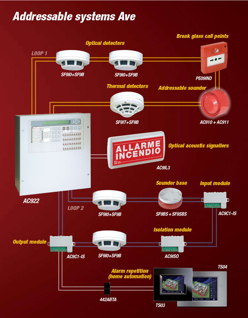 Fire detection systems can be integrated with the Ave smart home system using a special alarm interface, thus enabling visual and audible alarm signalling on the Touchscreen of home automation, saving the date and time of the alarm activation, and automatically activating the programmed scenarios in case of a fire (e.g. blackout, gas inlet closure, room desmoking, SMS alerts, etc.).