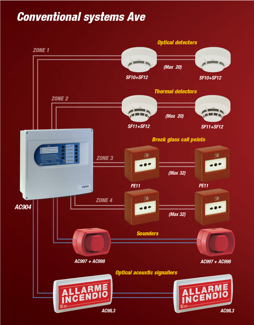 - AC904 - 4 conventional lines (zones), 20 detectors per line, 2 alarm sounder outputs, relay output for general alarms, relay output for system faults, EN54...