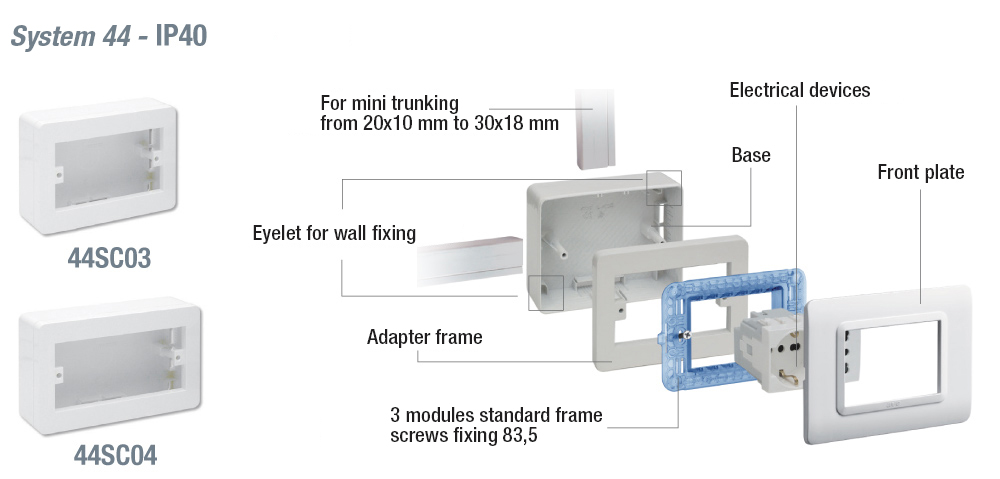 Characterised by various modes of application in different types of facilities, and most often in places where it is not necessary or difficult to install flush-mounted wiring accessories, such as: concrete walls and pillars in garages, corridors, stairways, warehouses, industrial halls and the like.