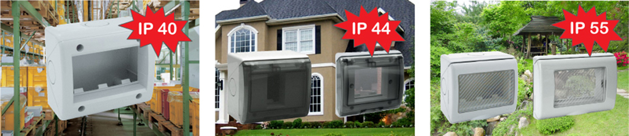 As with flush-mounted boxes, there are also universal, multifunctional versions of wall-mounted boxes that offer different applications depending on nothing more than the cover being used. For example, one box can be used as a junction box, either IP40 or IP55, as a switch and socket box or as a small consumer unit.